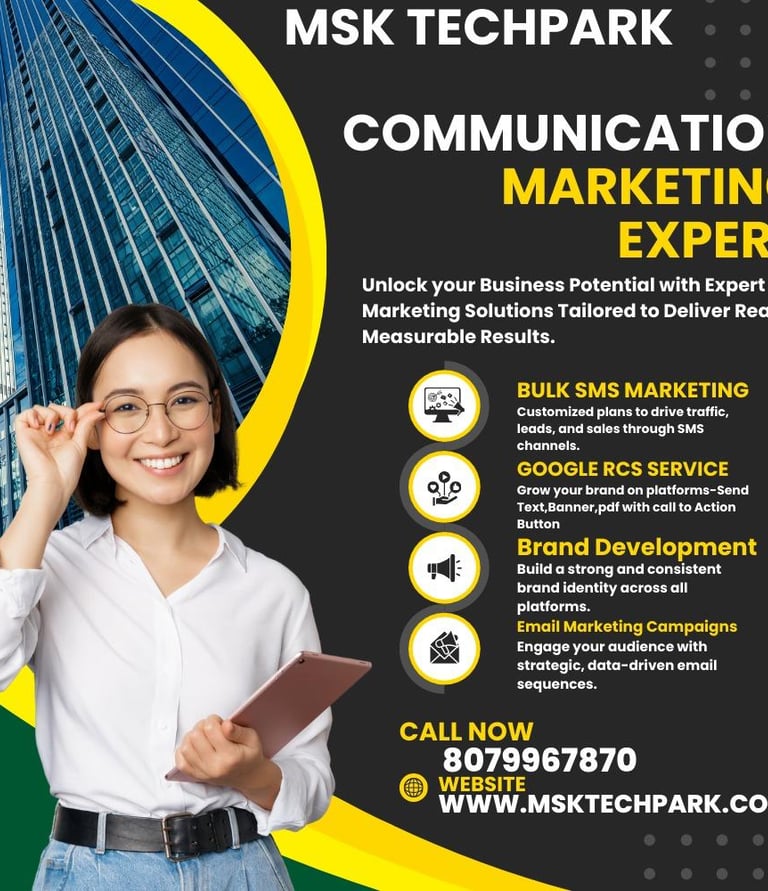 MSK TECHPARK Unit Of SIMPLYDIAL-MKS.COM Offering Diversified Communication Solutions & APIs - WhatsApp, Google Business Messaging, Email, SMS, RCS, Chatbot, Voice Solution etc. Given our global reach, support deliverability .We also Deal with Verified DATABASE in Category of Student & HINI Database with City & State Wise.